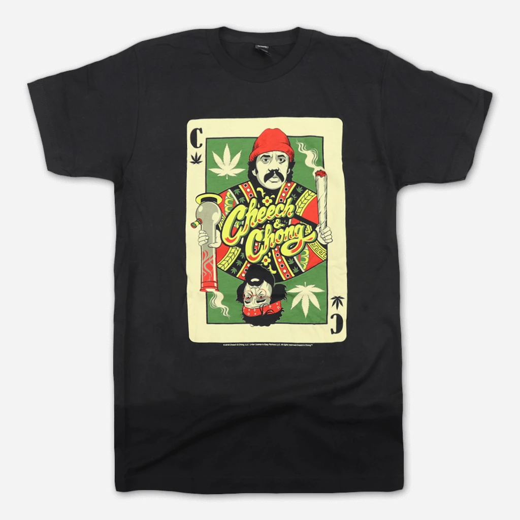A unisex soft fitted 30/1 cotton tee featuring a Cheech & Chong graphic printed on front. Black.