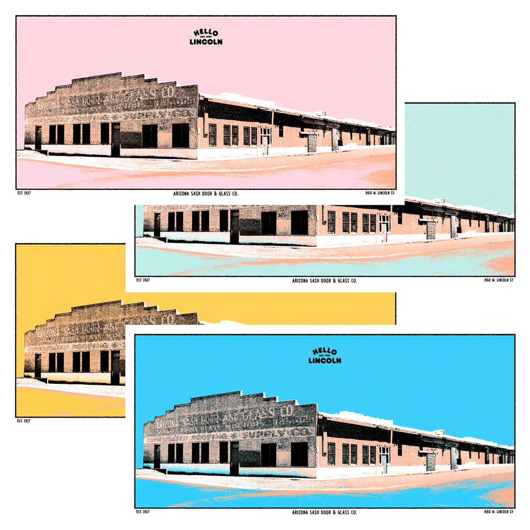 Hello Lincoln, home to Hello Merch & Hello Screen Printing, is a historic structure in the Downtown Phoenix historic Warehouse District. The original building was constructed in 1927 for the Arizona Sash, Door & Glass Company. The builder was G.F. Williams and the cost of the work was estimated at $15,663. Although the building permit, which is dated October 7, 1927, shows the address as 742 West Lincoln Street, city directories consistently show the address as 521 South 9th Avenue. The 1928 City Directory shows that the manager of the plant was Gustavus E. Engstrom and that the companyβs slogan was βGlass of All Kinds.β